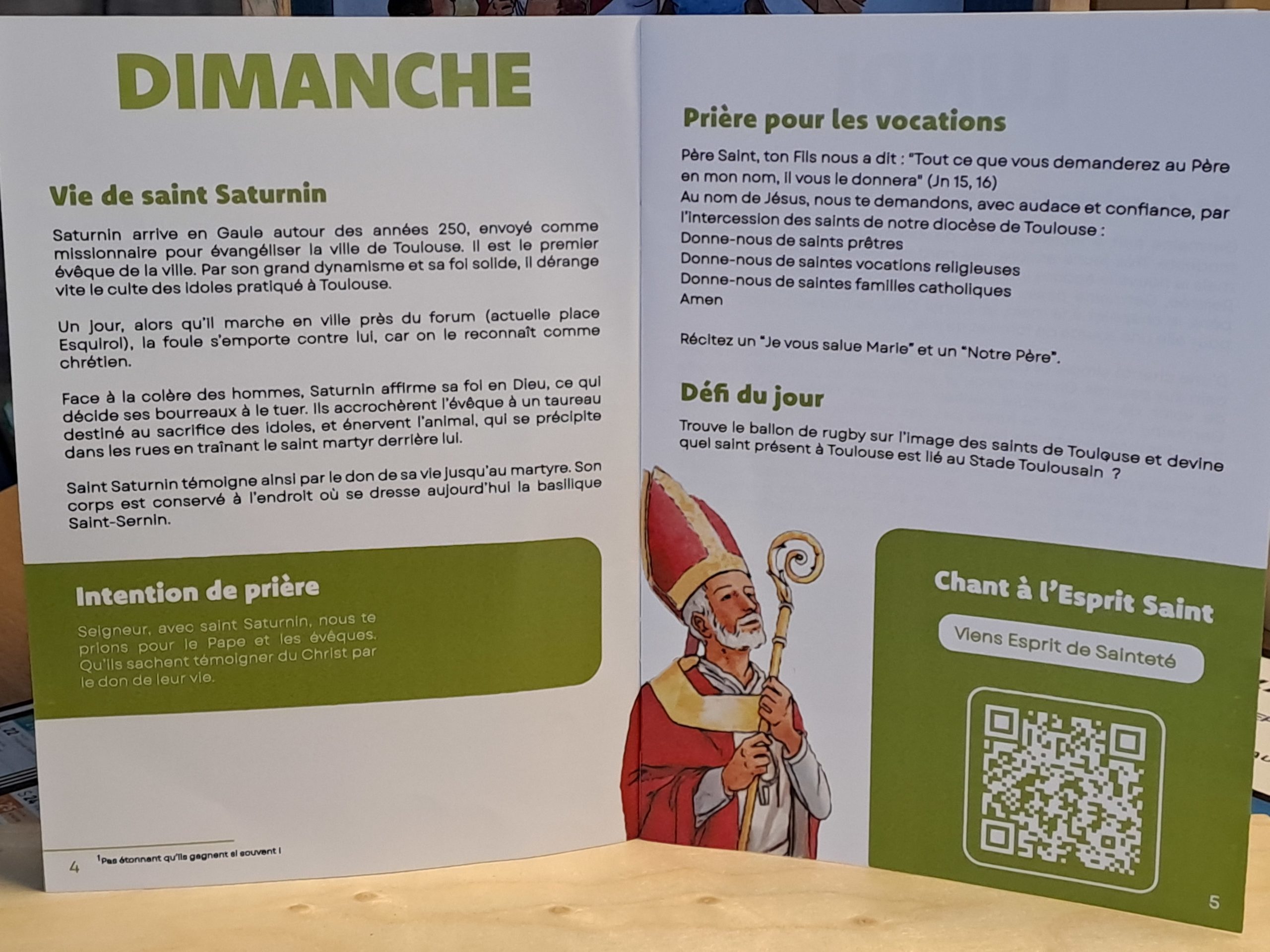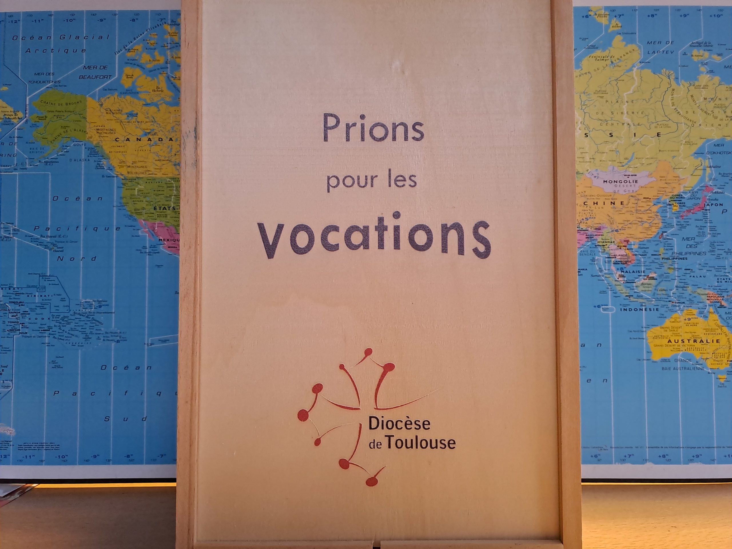 Dans une boîte en bois vous trouverez un livret pour prier pour les vocations pendant une semaine avec un saint différent chaque jour. Toute la marche à suivre est inscrite dans le livret.